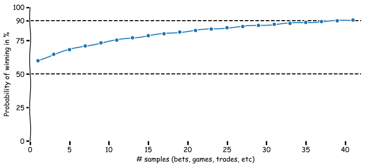 For a 7-game series (first to 4 wins), we sum the probabilities of winning 4, 5, 6, or 7 games (n = 7, k = 4, 5, 6, 7)—which comes to 71%. But what if you want 90% confidence? Working backwards, we solve for the smallest n such that P(X > n/2) ≥ 0.90—i.e., more wins than losses. The answer is 41 trades.